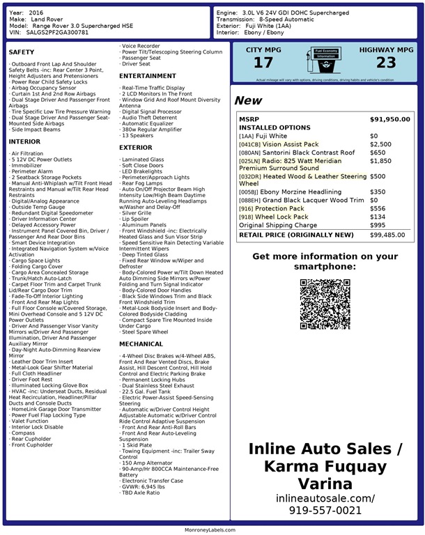 Inline Auto Sales / Karma attempts to provide accurate information on the inventory item listed above. The actual equipment may vary. Please confirm all vehicle options, accessories and prices with a sales associate to assure accuracy. This information is provided without representations or warranties of any kind, either expressed or implied. Prices do not include additional fees such as government fees and taxes, title and registration fees, finance charges, dealer document preparation fees, and emission testing