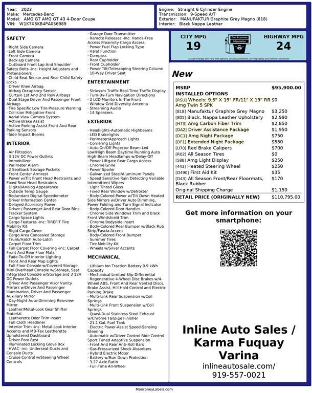 Inline Auto Sales / Karma attempts to provide accurate information on the inventory item listed above. The actual equipment may vary. Please confirm all vehicle options, accessories and prices with a sales associate to assure accuracy. This information is provided without representations or warranties of any kind, either expressed or implied. Prices do not include additional fees such as government fees and taxes, title and registration fees, finance charges, dealer document preparation fees, and emission testing