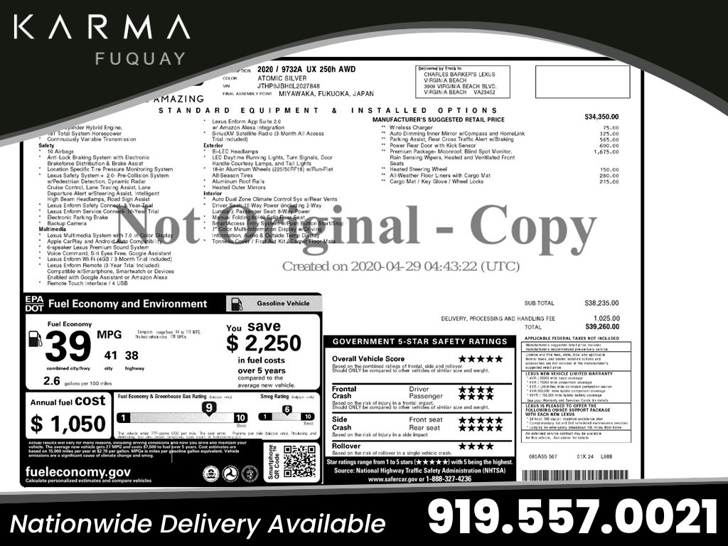 Inline Auto Sales / Karma attempts to provide accurate information on the inventory item listed above. The actual equipment may vary. Please confirm all vehicle options, accessories and prices with a sales associate to assure accuracy. This information is provided without representations or warranties of any kind, either expressed or implied. Prices do not include additional fees such as government fees and taxes, title and registration fees, finance charges, dealer document preparation fees, and emission testing