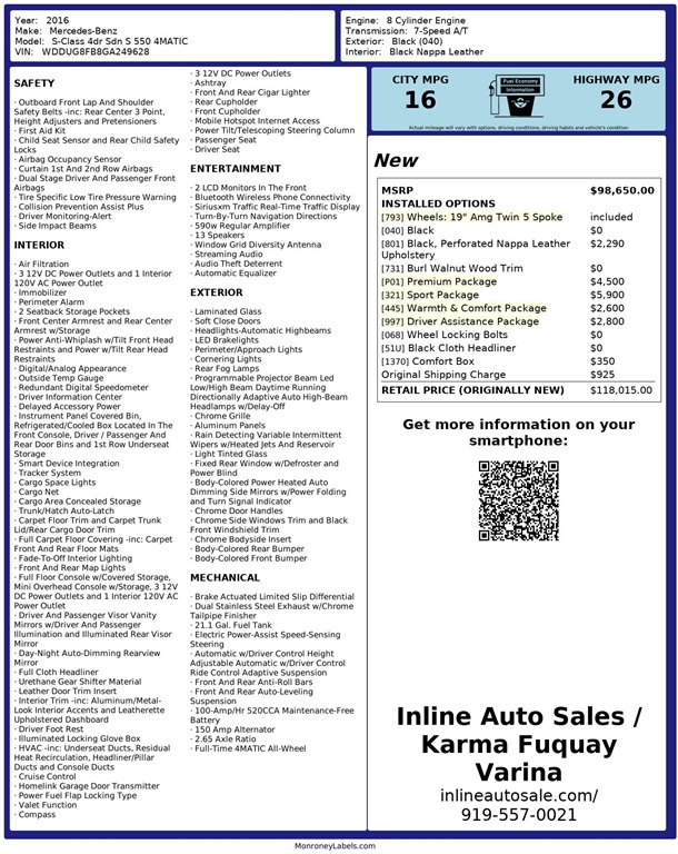 Inline Auto Sales / Karma attempts to provide accurate information on the inventory item listed above. The actual equipment may vary. Please confirm all vehicle options, accessories and prices with a sales associate to assure accuracy. This information is provided without representations or warranties of any kind, either expressed or implied. Prices do not include additional fees such as government fees and taxes, title and registration fees, finance charges, dealer document preparation fees, and emission testing
