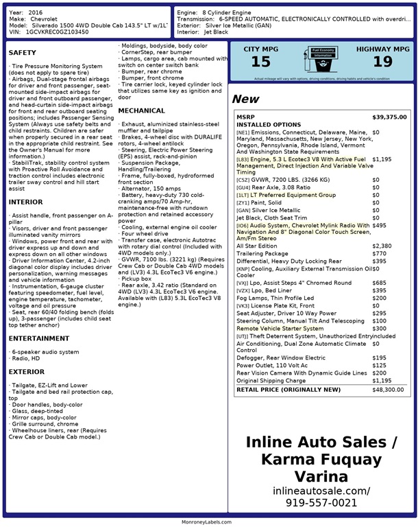 Inline Auto Sales / Karma attempts to provide accurate information on the inventory item listed above. The actual equipment may vary. Please confirm all vehicle options, accessories and prices with a sales associate to assure accuracy. This information is provided without representations or warranties of any kind, either expressed or implied. Prices do not include additional fees such as government fees and taxes, title and registration fees, finance charges, dealer document preparation fees, and emission testing