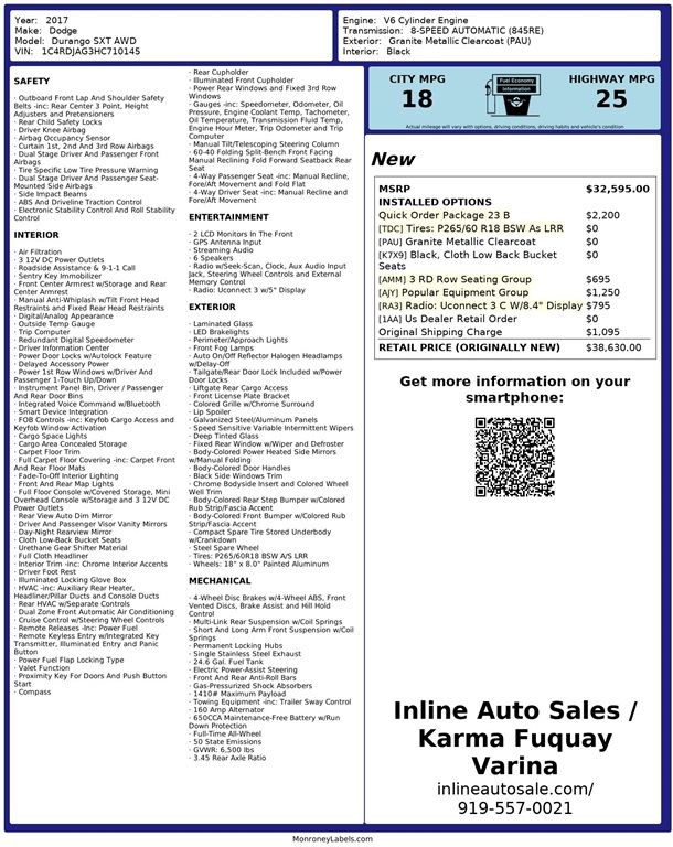 Inline Auto Sales / Karma attempts to provide accurate information on the inventory item listed above. The actual equipment may vary. Please confirm all vehicle options, accessories and prices with a sales associate to assure accuracy. This information is provided without representations or warranties of any kind, either expressed or implied. Prices do not include additional fees such as government fees and taxes, title and registration fees, finance charges, dealer document preparation fees, and emission testing